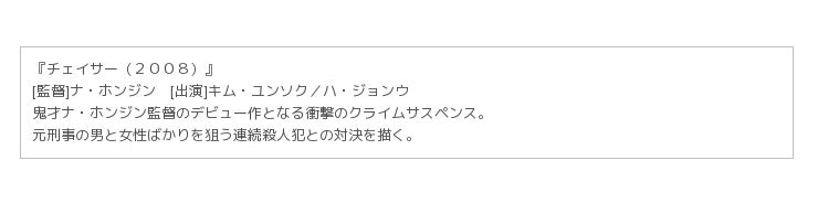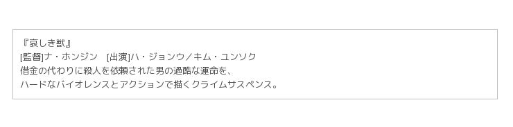 全世界で賛否両論を巻き起こした注目作『哭声/コクソン』、連続殺人鬼を追う男の追跡劇を過激なバイオレンスを交えて描いた衝撃のデビュー作『チェイサー(2008)』、外国人労働者の悲哀を圧倒的スケールと疾走感あふれる映像で描いた傑作『哀しき獣』の全3作品をお届けします。
