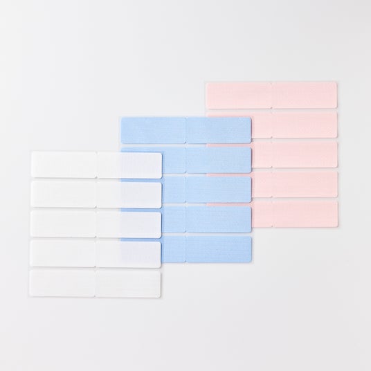 ラベルには薄く肌触りの良い生地を使用しています。油性お名前ペンを使用いただけます。白、桃、青の3色、用途に合わせて選べる3サイズをご用意しています。