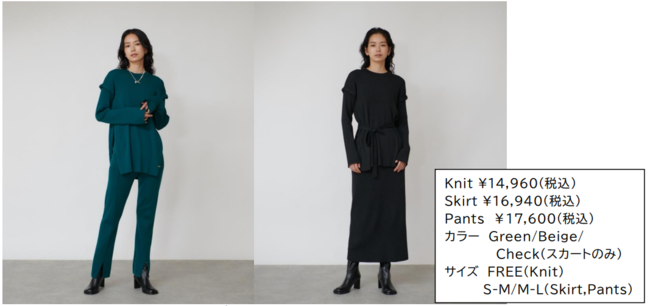環境に配慮し再利用したリサイクルポリエステル糸を使用した滑らかなニットトップスとスカートです。