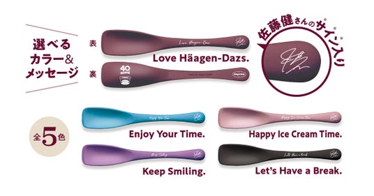 「絶対もらえる 40周年キャンペーン」第1弾では、ハーゲンダッツをご購入いただいたお客様にもれなく「佐藤健さんサイン入りオリジナル熱伝導スプーン」をプレゼントします。ご応募いただく際、全5種類のうちから、お好きな種類をおひとつお選びいただけます。