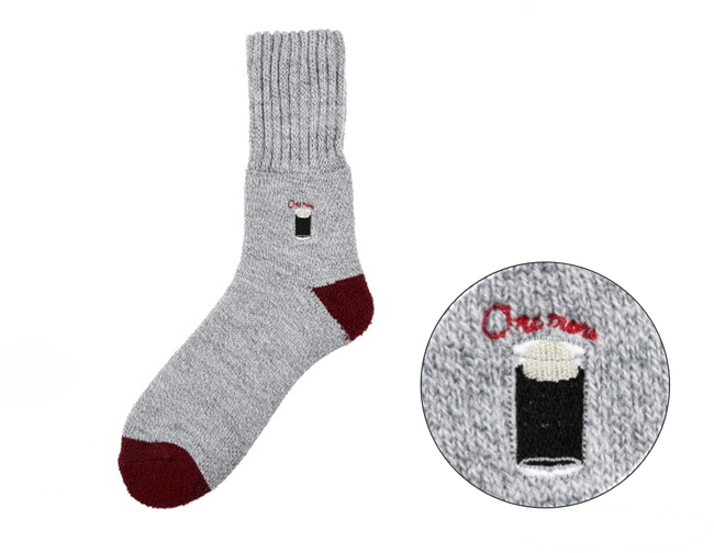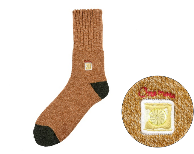 肉厚のウール混素材を使用した温かなルームソックス。ふんわり優しく足もとを包み込みます。Onemoreの文字とともにレモンを乗せたフレンチトーストやコーヒーフロートの刺繍モチーフがポイント。