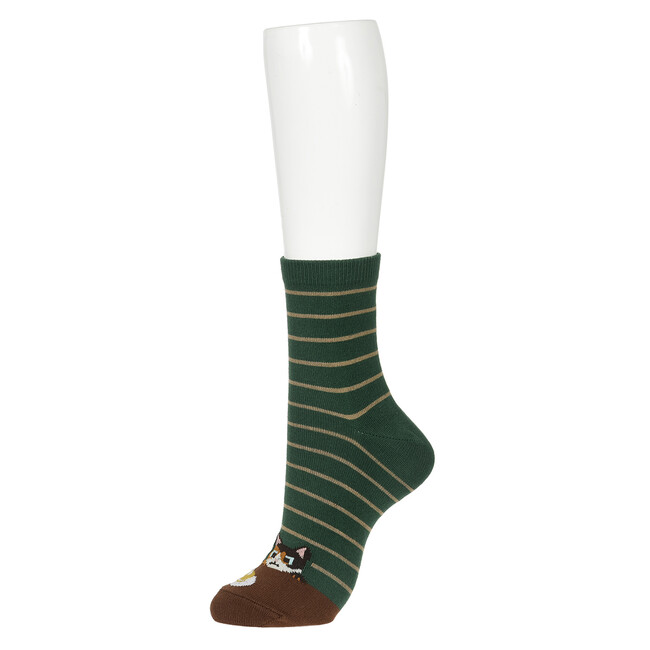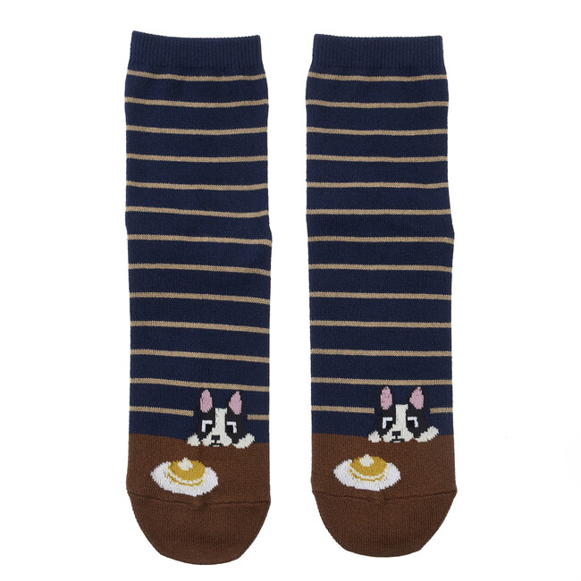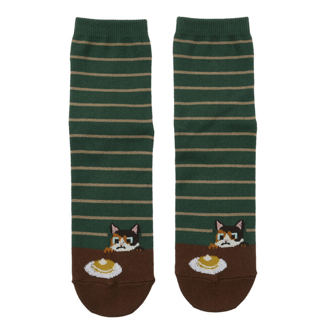 定番のボーダー柄には、おしそうなホットケーキを見つめるスコティッシュフォールドとフレンチブル。トラディショナルなソックスなのに、シューズを脱いだ時のサプライズが楽しいデザイン。