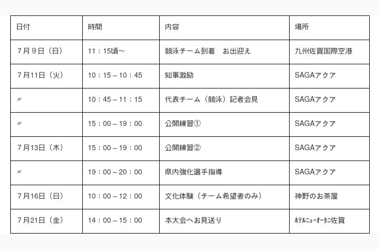 オーストラリア水泳代表は、2020年に開催された東京オリンピックで20個のメダルを獲得した強豪チームで、今大会でも注目のチームとなっています。11日(火曜日)、13日(木曜日)にはSAGAアクアにて公開練習も行われますので、世界トップレベルの泳ぎを間近でご覧ください。