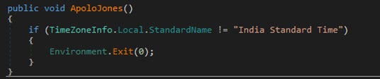 ElizaRATのすべての亜種は、ターゲットのシステムのタイムゾーンがインド標準時に設定されているかを確認する初期機能を備えていました。このことから、これらの攻撃キャンペーンがインドに関連するシステムを標的にしていたと考えられます。