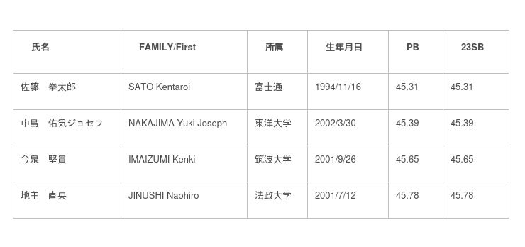 男子400mには、東京2020オリンピック4x400mリレー日本代表で、今年の日本グランプリシリーズ・静岡国際で8年ぶりの自己ベストとなる45秒31(日本歴代7位)で優勝した佐藤拳太郎(富士通)や、オレゴン2022世界選手権4x400mリレーにおいてアジア記録/日本記録(2分59秒51)で4位入賞を果たし、静岡国際で自己ベスト45秒39(日本歴代9位)をマークした中島佑気ジョセフ(東洋大学)が新たに決定。ブダペスト世界選手権4x400mリレーでメダルを獲得すべく、個々が成長した姿を見られるレースが期待されます。