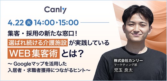 Googleビジネスプロフィール(旧・Googleマイビジネス)、Yahoo!プレイス、Appleマップなどの3大地図媒体、HP、アプリ、SNSなどの店舗集客媒体の一元管理サービス「カンリー店舗集客」の開発・提供を行う株式会社カンリー(所在地:東京都品川区、代表取締役:辰巳 衛,秋山 祐太朗)は、2025年4月22日(火)14時より無料セミナー「集客・採用の新たな窓口!選ばれ続ける介護施設が実践しているWEB集客術とは?~Googleマップを活用した入居者・求職者獲得につながるヒント~」をオンライン開催いたします。
