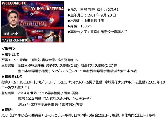 田㔟監督は卓球男子ナショナルチームの前監督であり、“新生琉球アスティーダ”では将来を担う若手選手の発掘・育成にも取り組みます。その一環として行う「アスティーダキャラバン47」では、琉球アスティーダの全国的な認知度向上とファン獲得を目指すとともに、日本卓球界全体の発展にも寄与してまいります。