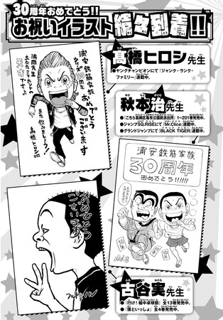 2023年2月2日(木)発売、週刊少年チャンピオン10号にて連載30周年を迎える「浦安鉄筋家族」シリーズ。これを記念して、W表紙&巻頭カラーで豪華企画とともに掲載! 佐藤二朗など著名人による祝福メッセージや、週チャン作家はもちろんのこと秋本治など会社の垣根を越えて豪華作家陣からの計40枚を超える描き下ろし祝福イラストは必見!!