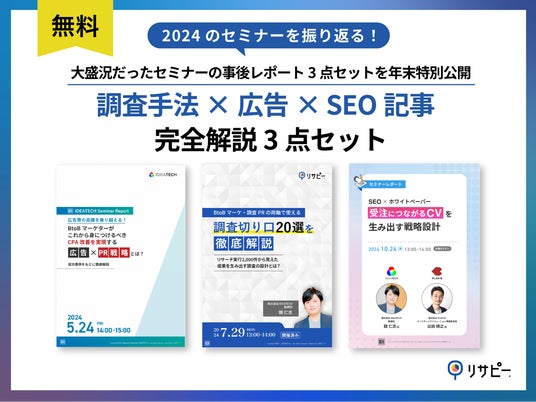 ワンストップでリサーチデータマーケティングを実現する「リサピー(R)️」(https://ideatech.jp/service/research-pr)を運営する株式会社IDEATECH(本社:東京都港区、代表取締役社長:石川友夫、以下 IDEATECH)は、2024年に大盛況だった「セミナーの事後レポート3点セット」を公開しました。