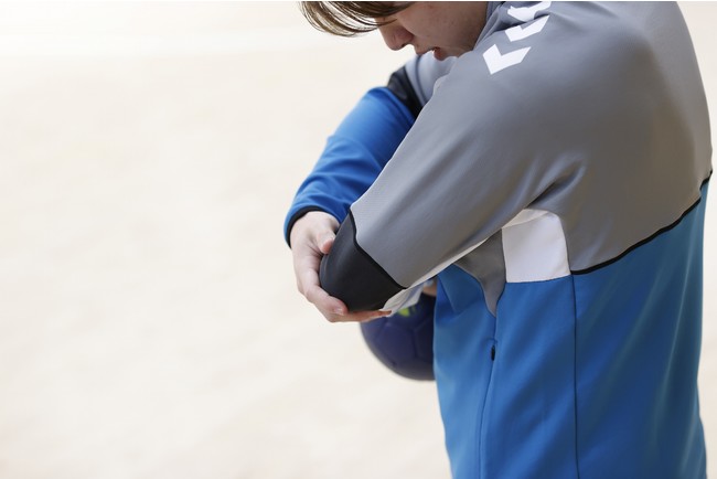 ハーフジップジャケットは、ファスナー位置をサイドネックに配置し、接触プレーでも気にならない設計に。