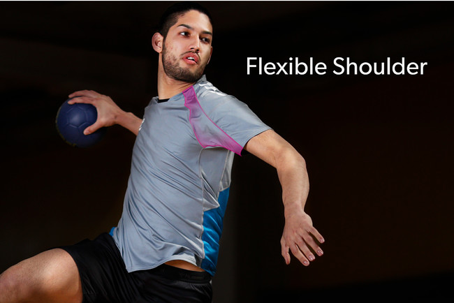 フレキシブルショルダーは、プラクティスシャツ専用の機能で、肩の筋肉のつきかたに合わせた立体パターン構造。腕の上げ下げをよりしなやかにサポートします。