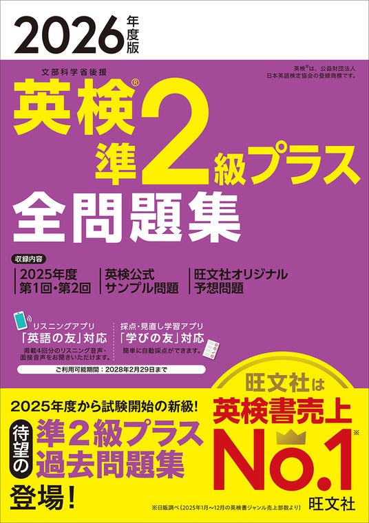 ※「2026年度版 英検(R)過去6回全問題集」シリーズ、ならびに『2026年度版 英検(R)準2級プラス 全問題集』の、アプリ「英語の友」・音声ダウンロードでの音声再生サービス、アプリ「学びの友」での自動採点をご利用いただける期間は2028年2月29日までとなります。なお、ご利用期間内にアプリやPCにダウンロードしていただいた音声・データは、期間終了後も引き続きお使いいただけます。