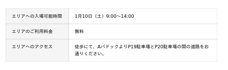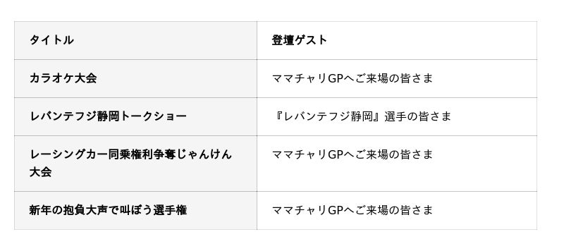 なお、今回の特設ステージは、1月9日(金)の前夜祭にご来場いただく皆さまの中から歌唱力に自信のある方を大募集!富士スピードウェイ初の 『カラオケ大会』 を開催いたします。他にも、ママチャリGPレース終了後におこなわれるレーシングカーデモラン同乗の権利をかけた 『じゃんけん大会』 や、プロサイクルロードレースチーム 「レバンテフジ静岡」 の選手たちを招いたトークショー、新年の抱負を存分に叫んでいただく 『大声選手権』 をおこないます。