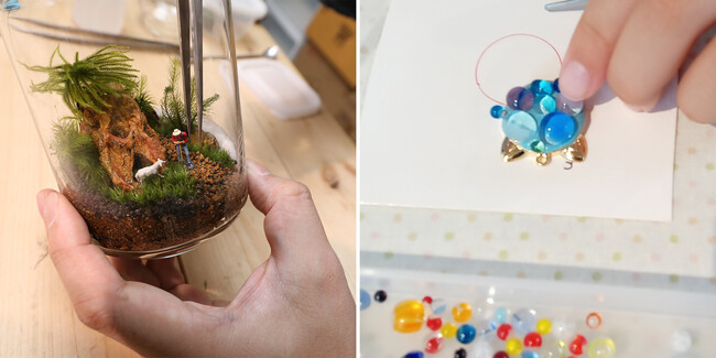 オリジナル作品が作れるワークショップコーナーでは普段使いのアクセサリーや日用雑貨など一日あたり約40ブースでワークショップを開催いたします。