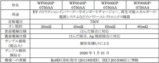 ・既存のトレンチ型SiC-MOSFETチップ(※5)に加え、使用範囲を広げるチップ4品種を新たにラインアップし、EVのトラクションインバーターやオンボードチャージャー、太陽光発電等の再生可能エネルギー用電源システムなどの、さまざまなパワーエレクトロニクス機器へのパワー半導体チップの組み込みニーズに対応