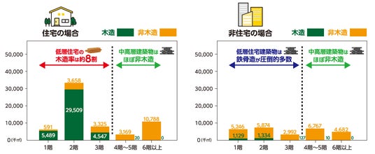 「1階から3階の低層非住宅」の木造率は約7%に留まっており、木造建築に携わる地域工務店にとっては大きなチャンスとなります。「1階から3階の低層非住宅・非木造」は合計約14,112,000平方メートル 。平方メートル 単価48万円とすると約7兆円規模のブルーオーシャンが創出されます。