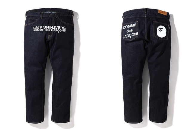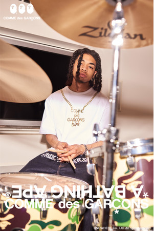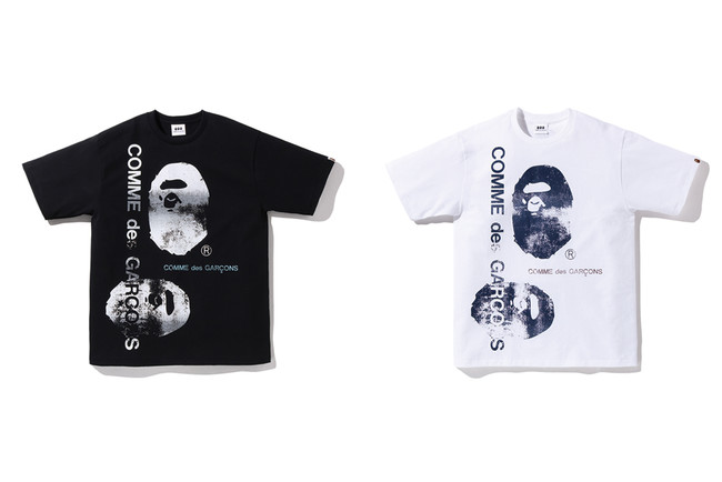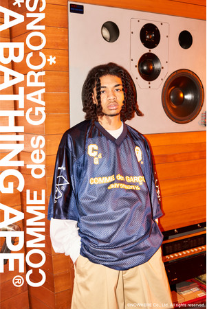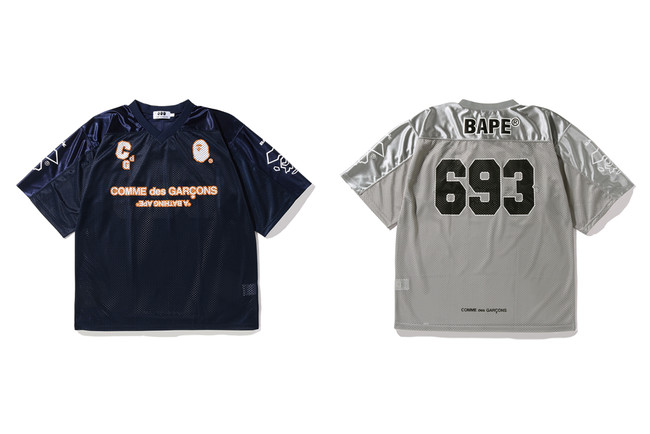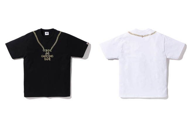ストライプシャツには、COMME des GARCONSのロゴとAPE HEADをムラのある手刷りの質感で表現。また、カレッジ調のデザインを裏からプリントしたTシャツ、両ブランドのロゴの向きを反転させたデニムパンツやフットボールシャツなど、シンプルかつ巧妙な視覚的ギミックが随所に落とし込まれています。加えて、COMME des GARCONSのアーカイブにオマージュした“COMME des GARCONS BAPE”のゴールドジュエリーグラフィックもインパクト抜群の仕上がりとなっています。