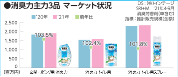 その中で「消臭力」シリーズの2021年上半期の売り上げ(玄関・リビング用、トイレ用、トイレ用スプレー)は、対前年同期比においていずれも伸長しました(図1)。