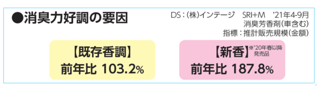 この背景として、2020年春以降に発売した新しい香りが2021年の上半期には前年比187.8%となり(図2)、消費者のニーズに向けて発売した香りが受け入れられています。