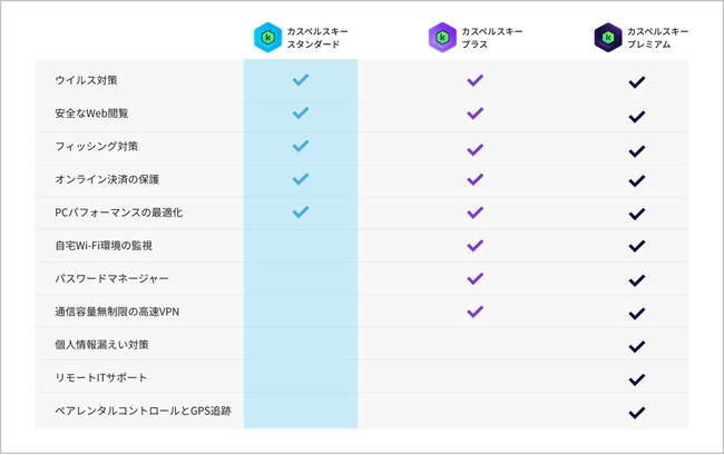新ラインナップの「カスペルスキー スタンダード」「カスペルスキー プラス」「カスペルスキー プレミアム」の三つのプランでは、それぞれのレベルに準じた機能を提供しています。