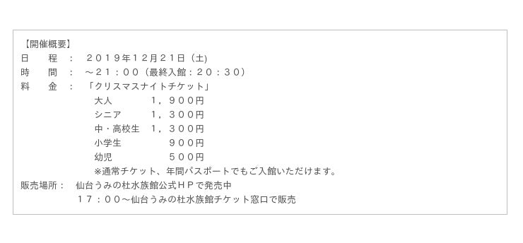 海と人、水と人との、新しいつながりを「うみだす」水族館、『仙台うみの杜水族館』では、2019年11月9日(土)~2020年3月1日(土)の期間、冬期限定のスペシャルイベント「UMINOMORI WINTER」を開催しております。2019年12月21日(土)、12月24日(火)には、2夜限定のクリスマスナイトイベントを開催いたします。