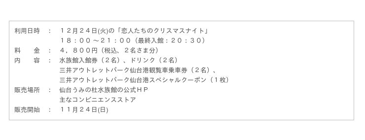 水族館入館券とホットドリンク、三井アウトレットパーク仙台港の観覧車乗車券やスペシャルクーポンがセットになった特別なペアチケットです。クリスマスイブのデートにピッタリなチケットです。