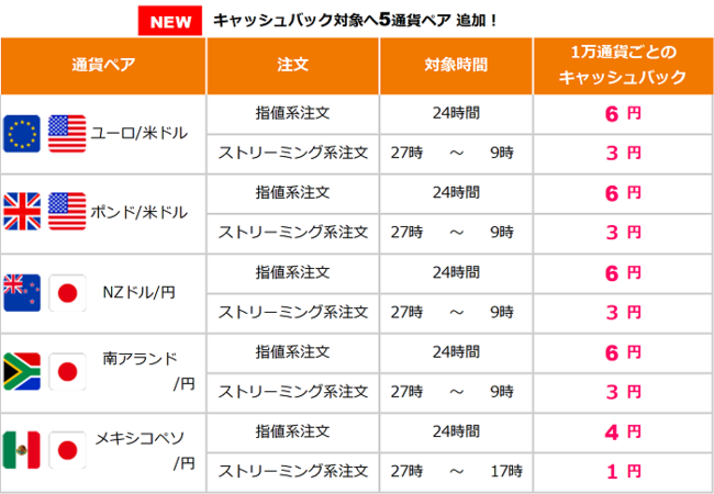 3月13日からは「ユーロ/米ドル」「ポンド/米ドル」「ニュージーランドドル/円」「南アランド/円」「メキシコペソ/円」もキャッシュバックの対象となります。ストレート通貨と新興国通貨も含まれるため、より多くの方にご参加いただけるキャンペーンになりました。是非お取引にお役立て下さい。