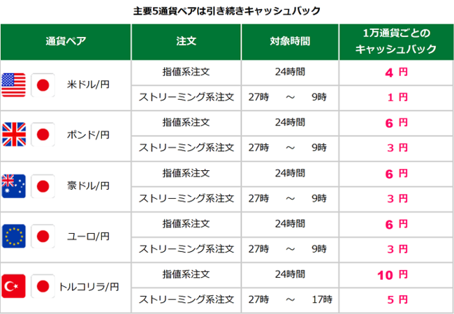 指値系注文は10通貨ペアすべてが24時間キャッシュバック対象!