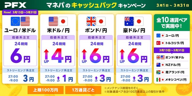 株式会社 マネーパートナーズ(代表取締役社長:福島秀治、本社:東京都港区)では、現在実施中の「PFXキャッシュバックキャンペーン(2023年3月)」のキャッシュバック対象通貨を5通貨ペアから10通貨ペアにパワーアップいたしました。
