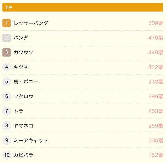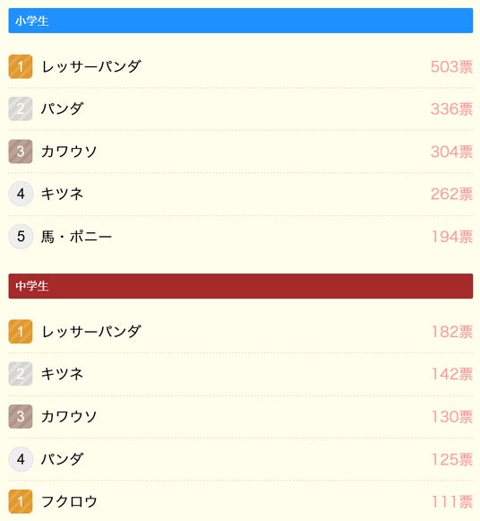 小中学生どちらも上位のランキングは同様で、1位は「ペンギン」、2位「イルカ」、3位に「ラッコ」でした。3位以下に100票以上の差をつけた「ペンギン」と「イルカ」は、小中学生から絶大な人気を得ていることがわかりました。