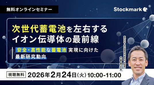製造業向けAIエージェント『Aconnect』を提供するストックマーク株式会社(以下、「当社」)はオンラインセミナー『次世代蓄電池を左右するイオン伝導体の最前線 ー 安全・高性能な蓄電池実現に向けた最新研究動向』を2月24日(火) に開催致します。