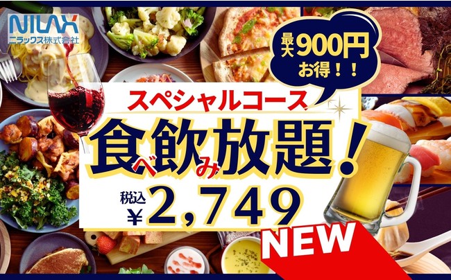 食べ放題のテーマパーク、 ニラックス株式会社(本社:東京都武蔵野市、 代表取締役:崎田 晴義)が運営する『グランブッフェ』『フェスタガーデン』などのブッフェレストラン13店舗にて、通常価格よりもオトクにスペシャルコースとアルコール飲み放題が堪能できる『食べ飲み放題コース』が新登場!