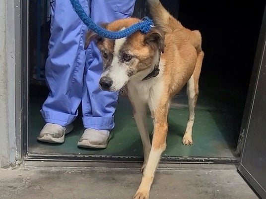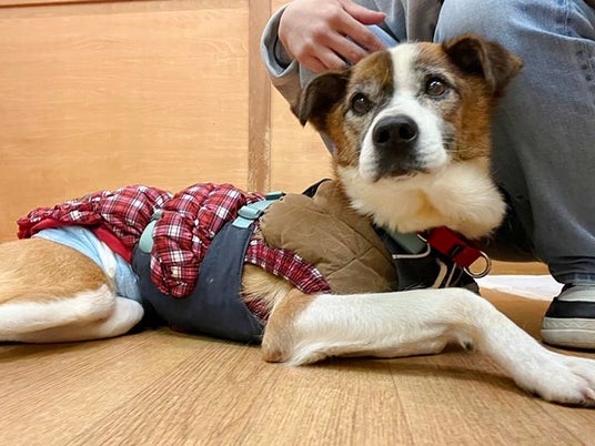 2024年9月24日に保護されてピースワンコにやってきた「オルド」は、当時推定10歳程度の高齢犬で、飼い主に捨てられたと推測されガリガリに痩せていました。保護後に検査したところ、両足の膝蓋骨脱臼(パテラ)、軽度の白内障、甲状腺機能低下症、軽度の変形性関節症による骨の変形、左前肢の腫瘍など様々な疾患を抱えており、すぐに治療とケアが始まりました。ですが「オルド」はとてもいい子で、どんな治療も嫌がらず大人しく受けてくれました。