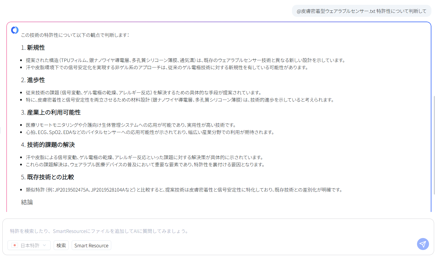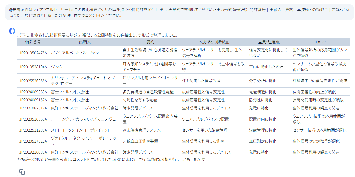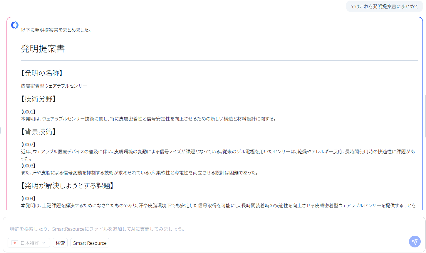 AIが汗・皮脂環境下での信号安定性に寄与する要素を特定し、特許化可能性の高い構造組合せを提示した。これにより、開発初期段階で発明提案書の原案を自動生成することが可能となった。