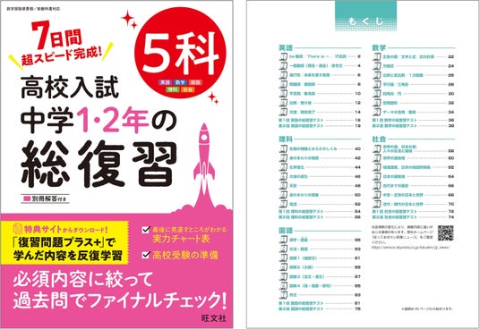 教育出版の株式会社旺文社(東京都新宿区/代表取締役社長 粂川 秀樹)は、『高校入試 中学1・2年の総復習 英語 新装三訂版』『高校入試 中学1・2年の総復習 数学 新装三訂版』『高校入試 中学1・2年の総復習 国語 新装三訂版』『高校入試 中学1・2年の総復習 理科 新装三訂版』『高校入試 中学1・2年の総復習 社会 新装三訂版』『高校入試 中学1・2年の総復習 5科』