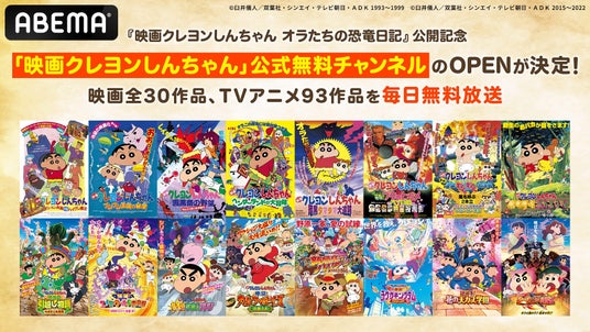 このたび「ABEMA」にて新規OPENが決定した「映画クレヨンしんちゃん」公式無料チャンネルでは、「映画クレヨンしんちゃん」30作品のほか、TVアニメ『クレヨンしんちゃん』93エピソードを、毎日ノンストップで無料放送いたします。