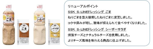 エスエスケイフーズ株式会社(本社:静岡市葵区)は、日頃ご愛顧いただいている業務用商品の「SSK S‐LINEドレッシング ごま」、「SSK S‐LINEドレッシング シーザーサラダ」の2品を、さらにおいしくリニューアルいたします。