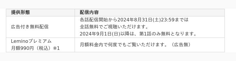 ・ 「Leminoプレミアム(App Storeでの購入)」「Leminoプレミアム(Google Playでの購入)」「Leminoプレミアムプリペイドカード」「Leminoプレミアム視聴用シリアルコード」をご利用のお客さまは、適用対象外です。