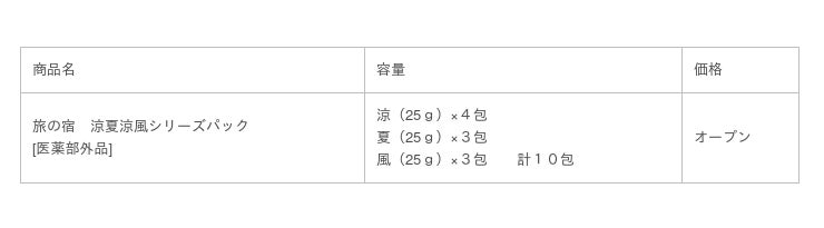 「旅の宿 涼夏涼風」は、3種類・10包入りのお徳用シリーズパックです。シトラスミントの香りの「涼」、ハーバルミントの香りの「夏」、フレッシュミントの香りの「風」の3種で、それぞれに肌をいたわる保湿成分を配合しています。「温泉ミネラル」、「温泉含有香気成分」、「生薬」(チンピ・トウキ)に加え、「メントール」を配合した夏のお風呂にうれしいクールタイプの入浴剤で、毎年ご好評をいただいております。