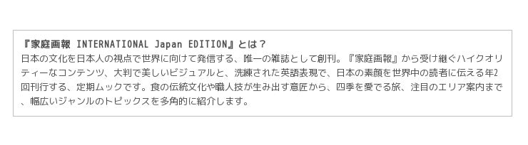 株式会社世界文化社(東京都千代田区九段北/代表取締役社長:鈴木美奈子)は、日本の文化を日本人の視点で世界に向けて発信する雑誌『家庭画報 INTERNATIONAL Japan EDITION 2017年秋/冬号』を9月1日(金)に刊行しました。