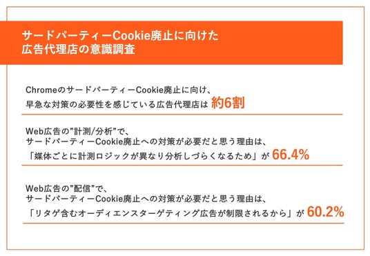 Web施策の支援を実施している多くの広告代理店では、現在ユーザーを効率的に呼び込む手段として、事業上欠かせない存在とも言えるリターゲティング広告ですが、2024年のChromeのサードパーティーCookie廃止により、このまま何も対策を打たなければ、効率低下が避けられません。そういった背景の下、ChromeのサードパーティーCookie廃止に関して、広告代理店担当者201名を対象にアンケート調査を行いました。