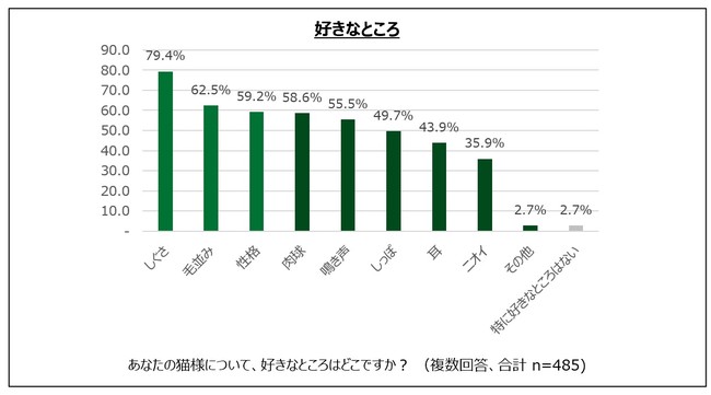 猫様の好きなところについて質問したところ、好きなポイントの1位は「しぐさ」(79.4%)、2位は「毛並み」(62.5%)、3位は「性格」(59.2%)とつづき、猫様の内面・外面ともに魅力を感じていることが明らかに。