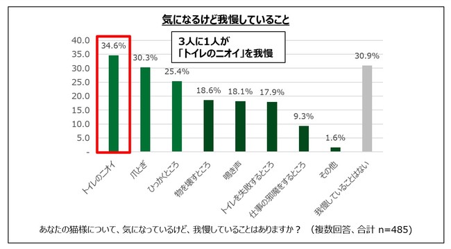 一方で、 猫様について気になっているけど我慢してしまうところについては1位が「トイレのニオイ」(34.6%)、2位は「爪とぎ」(30.3%)、3位は「ひっかくところ」(25.4%)という結果になり、3人に1人が可愛い猫様のトイレのニオイを我慢してしまっているという実態が浮き彫りになりました。