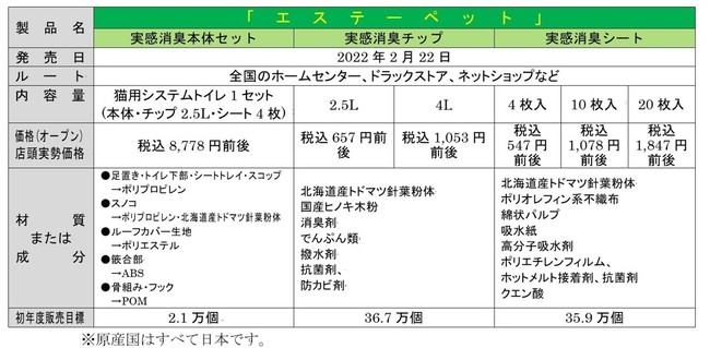 エステーは「エステーペット」ブランドの第一弾として、猫用システムトイレ「エステーペット 実感消臭本体セット」、「エステーペット 実感消臭チップ(2アイテム)」、「エステーペット 実感消臭シート(3アイテム)」をそれぞれ2月22日から全国のホームセンター、ドラッグストア、ネットショップなどで新発売します。価格はすべてオープンとなりますが、店頭での実勢価格は税込み547円前後~8,778円前後となります。