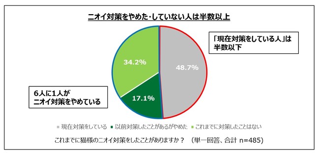 猫様のニオイ対策の実態について聞いたところ、「現在対策をしている」(48.7%)と何らかのアクションを取り続けている方は半数以下にとどまり、「以前対策したことがあるがやめた」(17.1%)「これまでに対策したことはない」(34.2%)が計51.3%と、ニオイ対策をしていない人のほうが多くを占める結果に。特に、6人に1人の飼い主が、何らかの理由でニオイ対策をやめていることが判明しました。