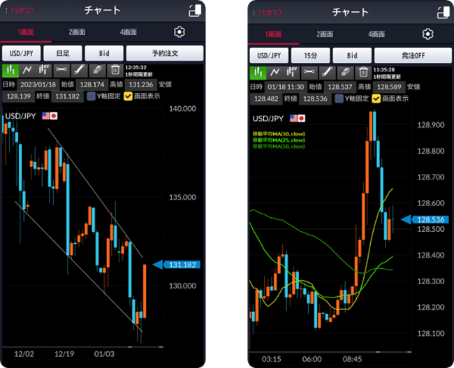 スマートフォンからでもライン描画が可能になりました。テクニカル指標との組み合わせでスマートフォンからでも、PC顔負けの相場分析が可能です。