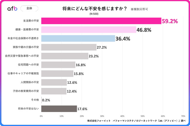 パフォーマンステクノロジーネットワーク「afb(アフィビー)」< https://www.afi-b.com/ >の開発運用をおこなう株式会社フォーイットは、全国の20代~60代までの男女500人を対象に将来の不安に関するアンケートを実施し、年代別・男女別等の特徴についてまとめました。