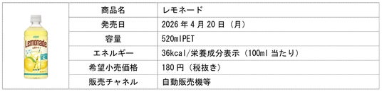ダイドードリンコ株式会社(本社:大阪市北区、代表取締役社長:中島 孝徳)は、2026年春夏の新商品として、「レモネード」を4月20日(月)より発売しますので、お知らせいたします。