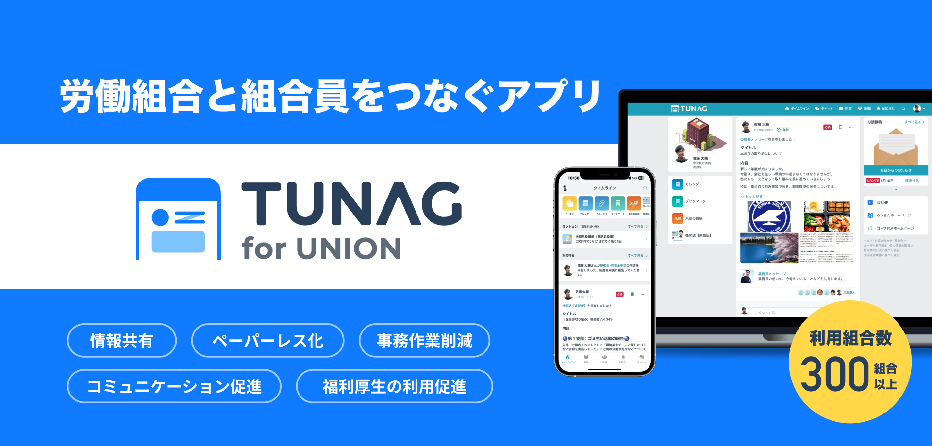 TUNAG for UNIONは、組合活動に必要な情報を集約できるアプリです。2022年1月サービスリリースし、業種業態・規模問わず様々な組合に導入いただき、現在300以上の組合にご活用いただいております。労働組合に関する全ての情報について、「発信するだけでなく、一人ひとりに受け取ってもらう」ことまでを重視しています。