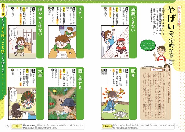 「やばい」「ウケる」「エモい」といった、子どもが頻繁に使いがちなことばの言い換えことばを掲載。楽しく語彙力を高められ、より豊かな表現ができるようになります。